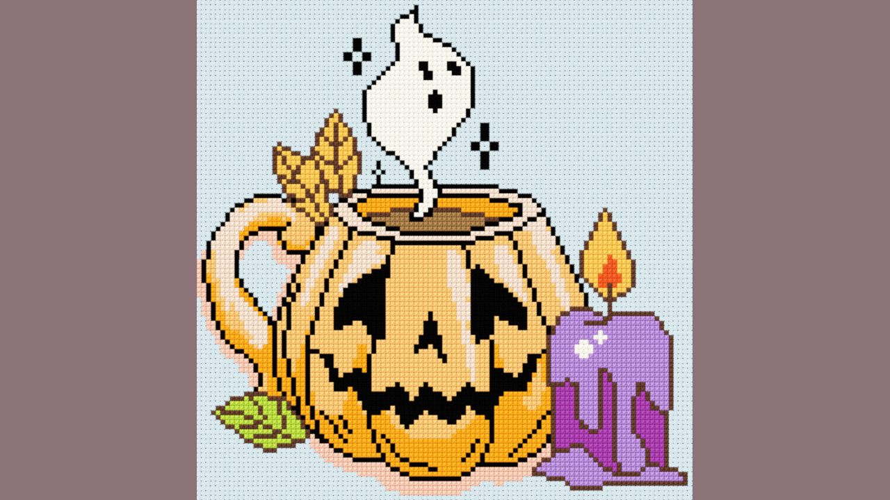 Get ready for Halloween with this lovely cross stitch pattern showing a big pumpkin cup next to a purple candle. Easy pattern to follow and great for both new and experienzed cross stitchers.